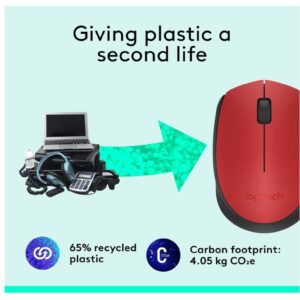 - Plastique recyclé : Les composants en plastique de la souris M171 sont fabriqués à partir de plastique certifié recyclé post-consommation (59% minimum pour le modèle Noir), afin d’offrir une nouvelle vie au plastique issu d’anciens produits électroniques grand public et contribuer à réduire l’empreinte carbone.